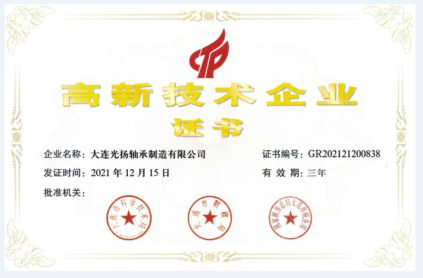 媒體中心大連光揚(yáng)軸承制造有限公司順利通過(guò)“高新技術(shù)企業(yè)”復(fù)審認(rèn)定,并收到了大連市科學(xué)技術(shù)局、大連市財(cái)政局、國(guó)家稅務(wù)總局大連市稅務(wù)局聯(lián)合頒發(fā)的《高新技術(shù)企業(yè)證書(shū)》。